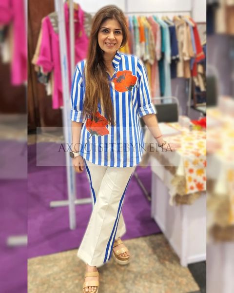Cotton stripes coordinate elegantly with rose applique work for cool and breezy ensembles crafted by #shopaxquisite. A must-have cotton set for modern style. Super-fine fabric for unparalleled comfort.
