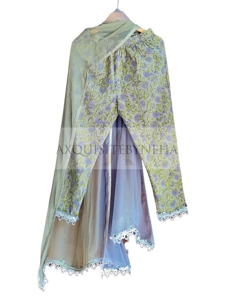 Exquisitely crafted in a combination of olive green and grey hues, this HandBlock suit is composed of a luxuriously soft cotton fabric, accented with a beautiful chiffon lacework dupatta.