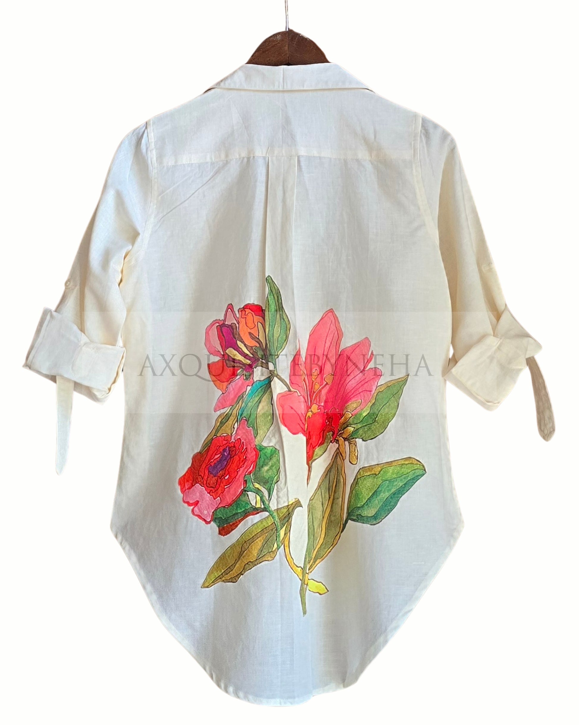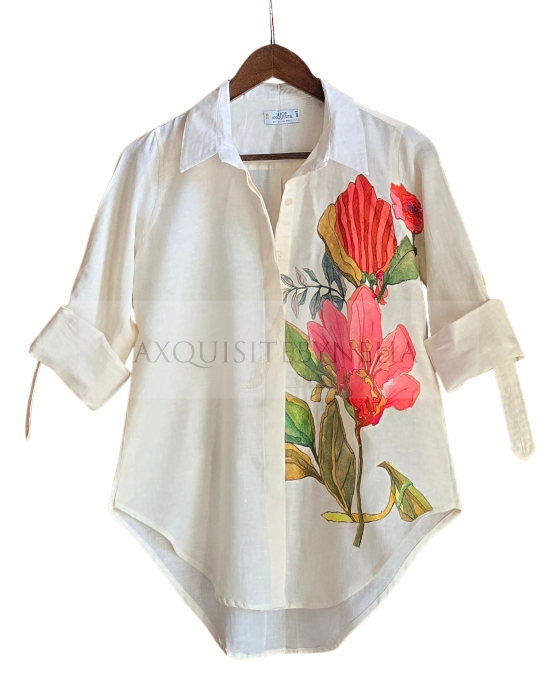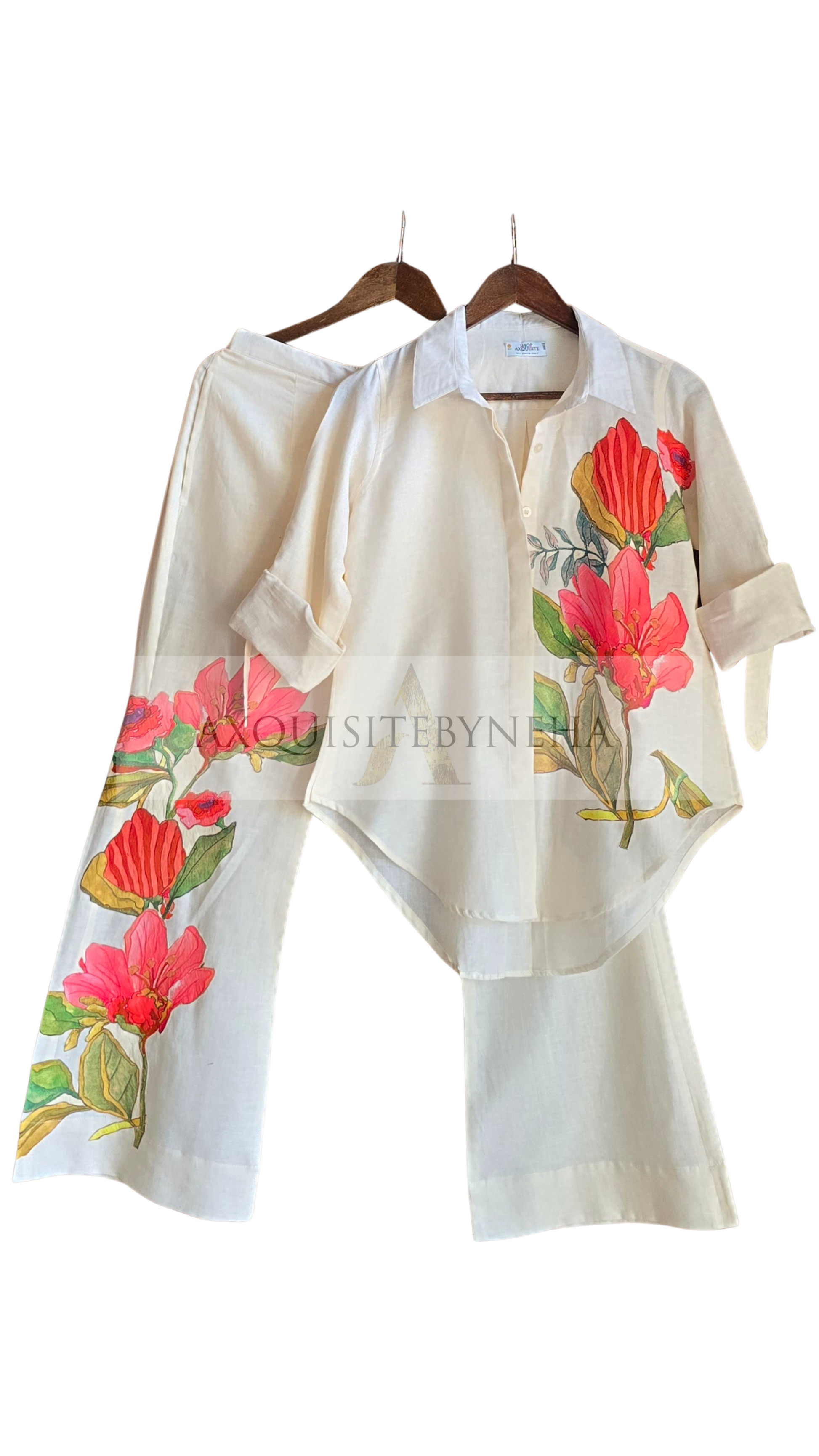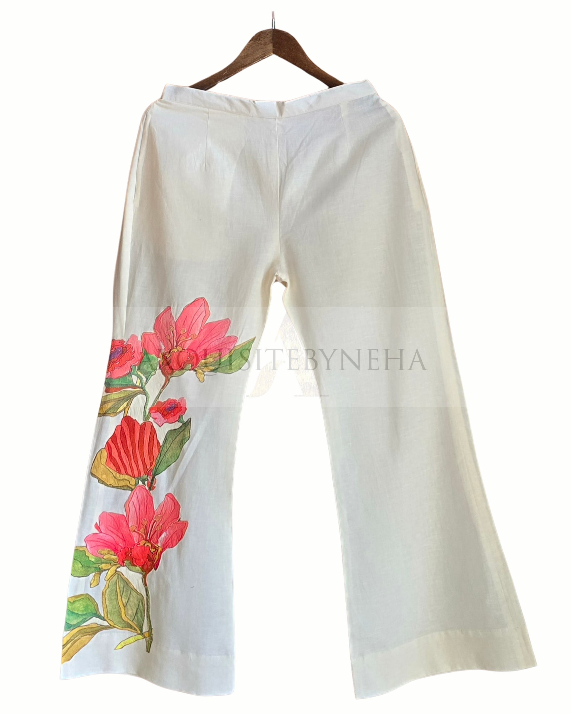 Crafted from a soft and luxurious cotton linen crepe fabric, Blooming is a coordinated set for women in an elegant ivory color. With delicate applique work detailing, this set exudes sophistication and comfort. Perfect for any occasion, it will elevate your style with its subtle yet noticeable features.