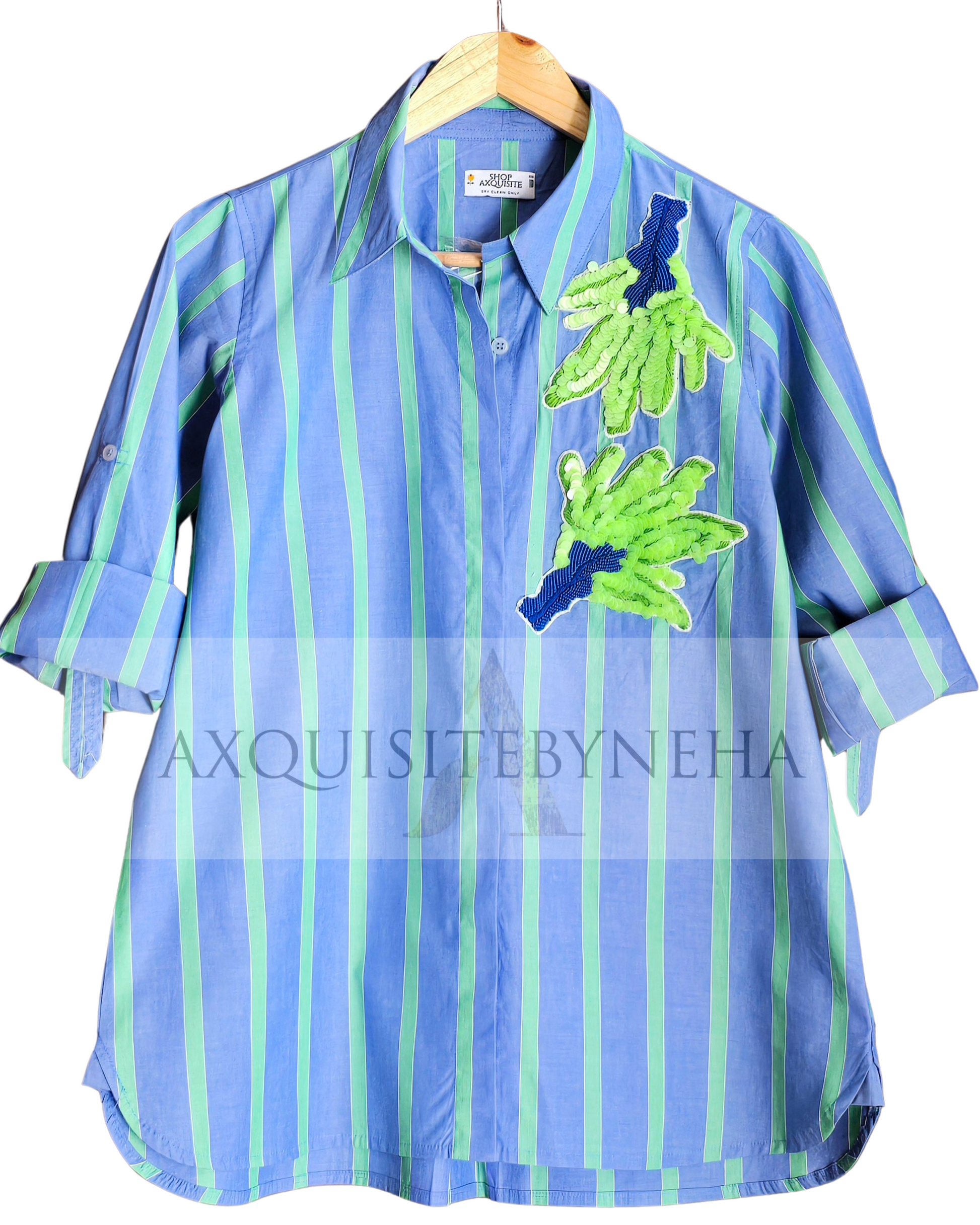 "Indulge in effortless style with our Blue & Green shirt and denim pants combo. The luxurious cotton material features stunning sequin details, elevating your look to chic sophistication. The classic blue and green stripes add a touch of playfulness to the ensemble. Upgrade your wardrobe with this exclusive piece."