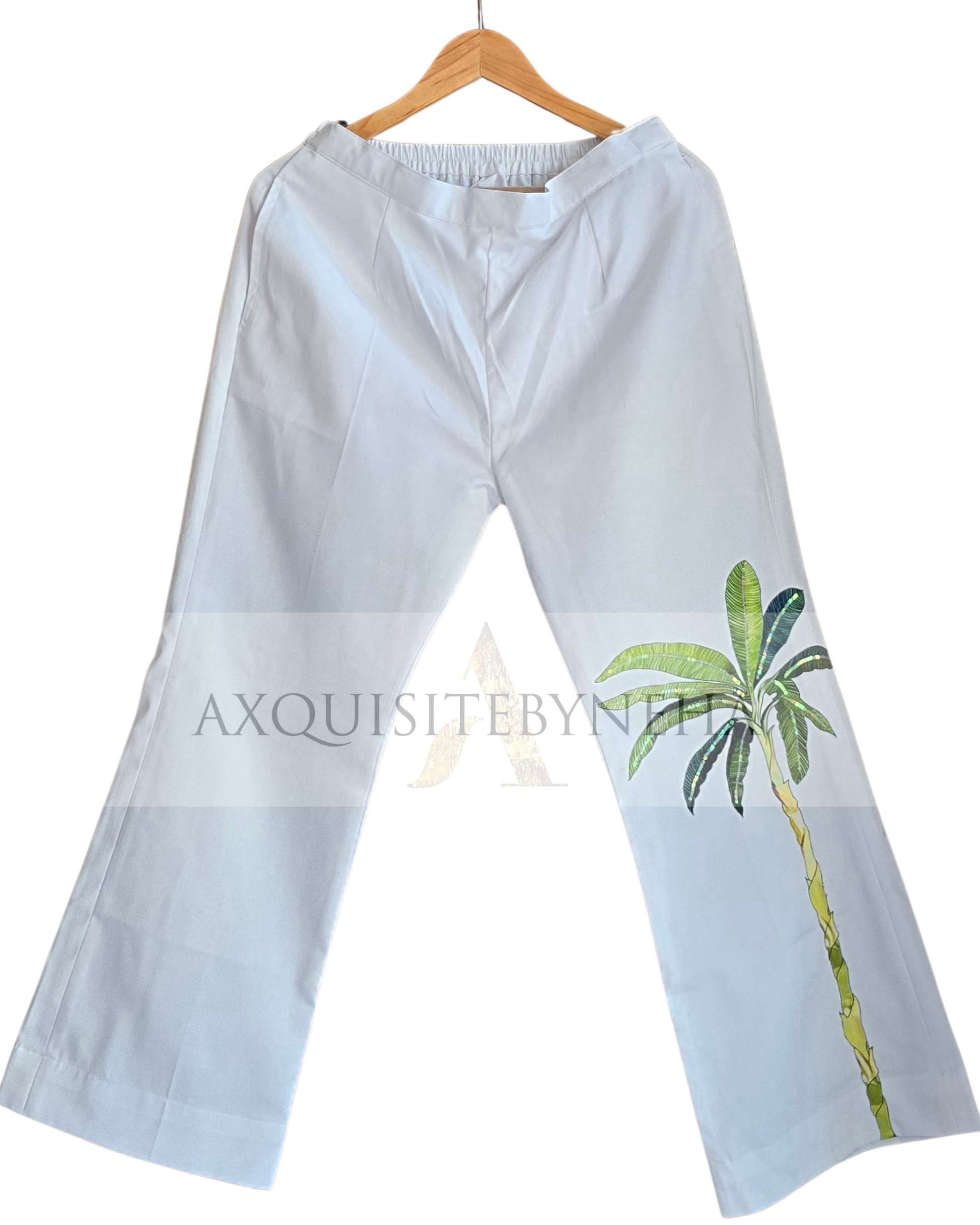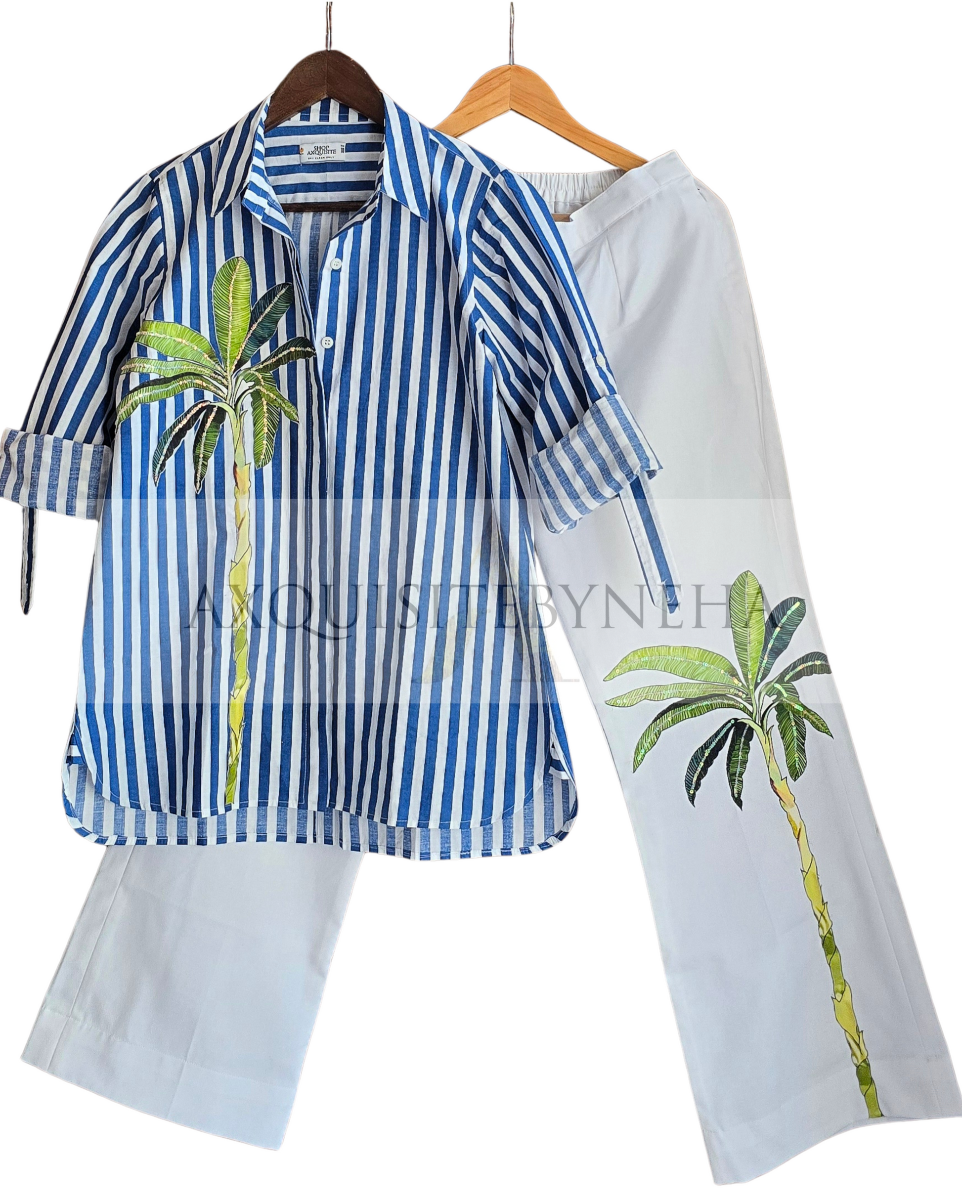 With our luxurious Blue Stripes Pine Tree set, made with high quality 100 percent cotton, this set features a blue striped top with an intricately detailed pine tree adorned in shiny sequins. Paired with crisp white twill pants, this set is the epitome of elegance and sophistication. Elevate your style and make a statement with this exclusive set.