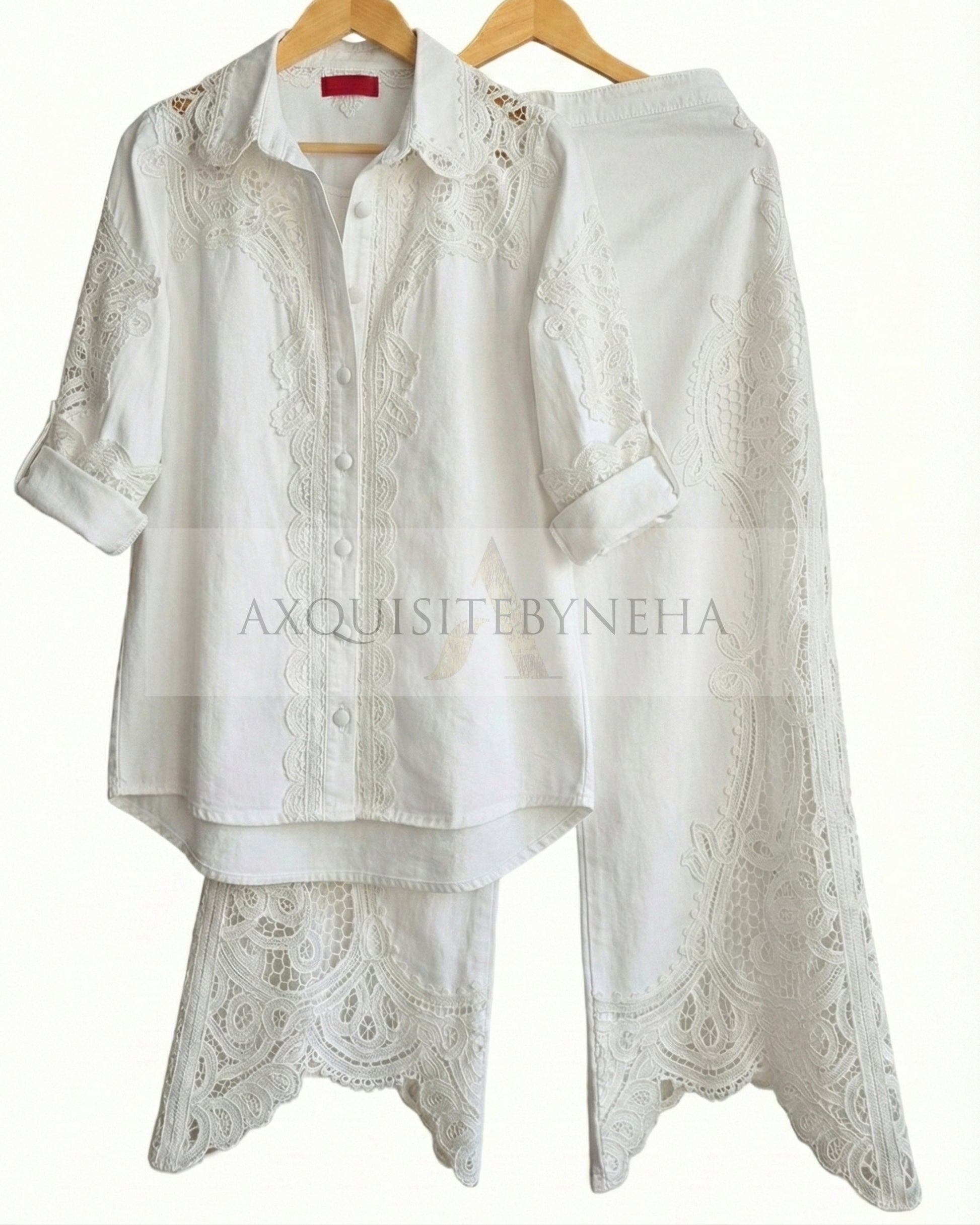 ​We are obsessed with the stunning cutwork lace on our new linen coord set.