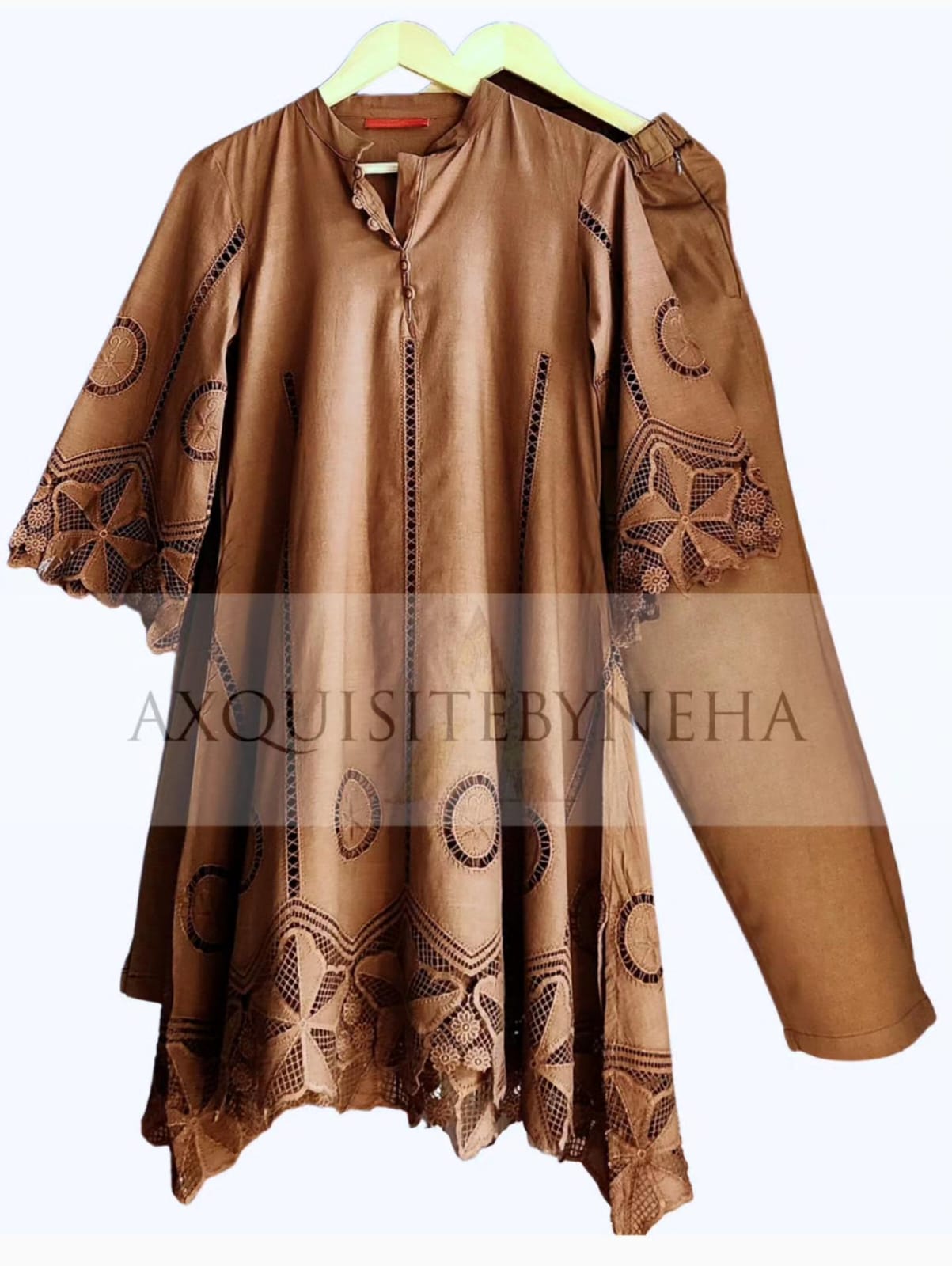 Brew yourself up a style storm with this Coffee Aline Chikan set! Perfectly crafted with chic, coffee colour on cotton fabric and elegant chikan embroidery, this classic set is sure to have you caffeinated with fashionable flair. Sip and be seen!