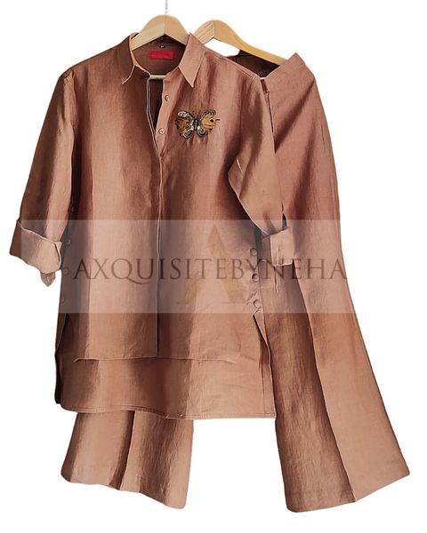 Introducing the Coffee ButterFly set, expertly crafted from Super Fine cotton-linen fabric. Featuring a stunning butterfly motif, this coord set is available in all sizes. Elevate your style with the rich coffee hue and luxurious material.