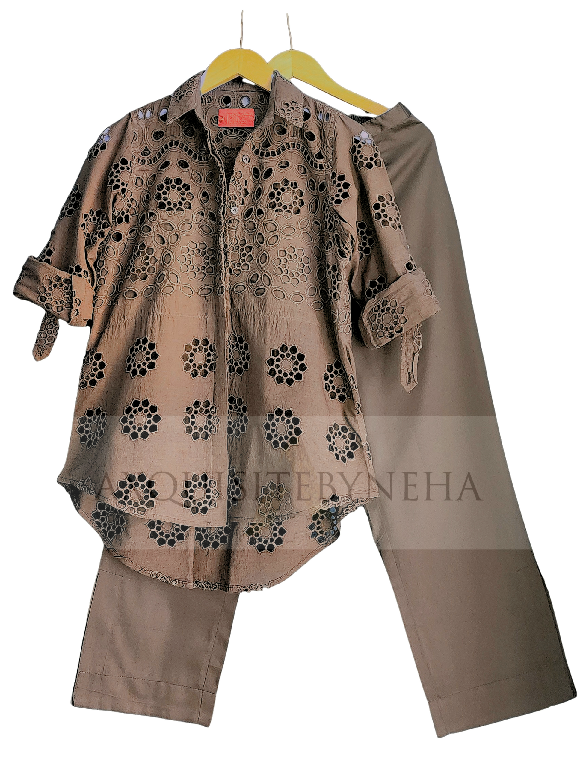 Coffee colour embroidered set is made of high-quality cotton fabric for a luxurious feel. The intricate embroidery adds a touch of elegance, making it perfect for any casual outings. Crafted with precision and attention to detail, this set is both stylish and comfortable. Elevate your wardrobe with this exquisite piece.