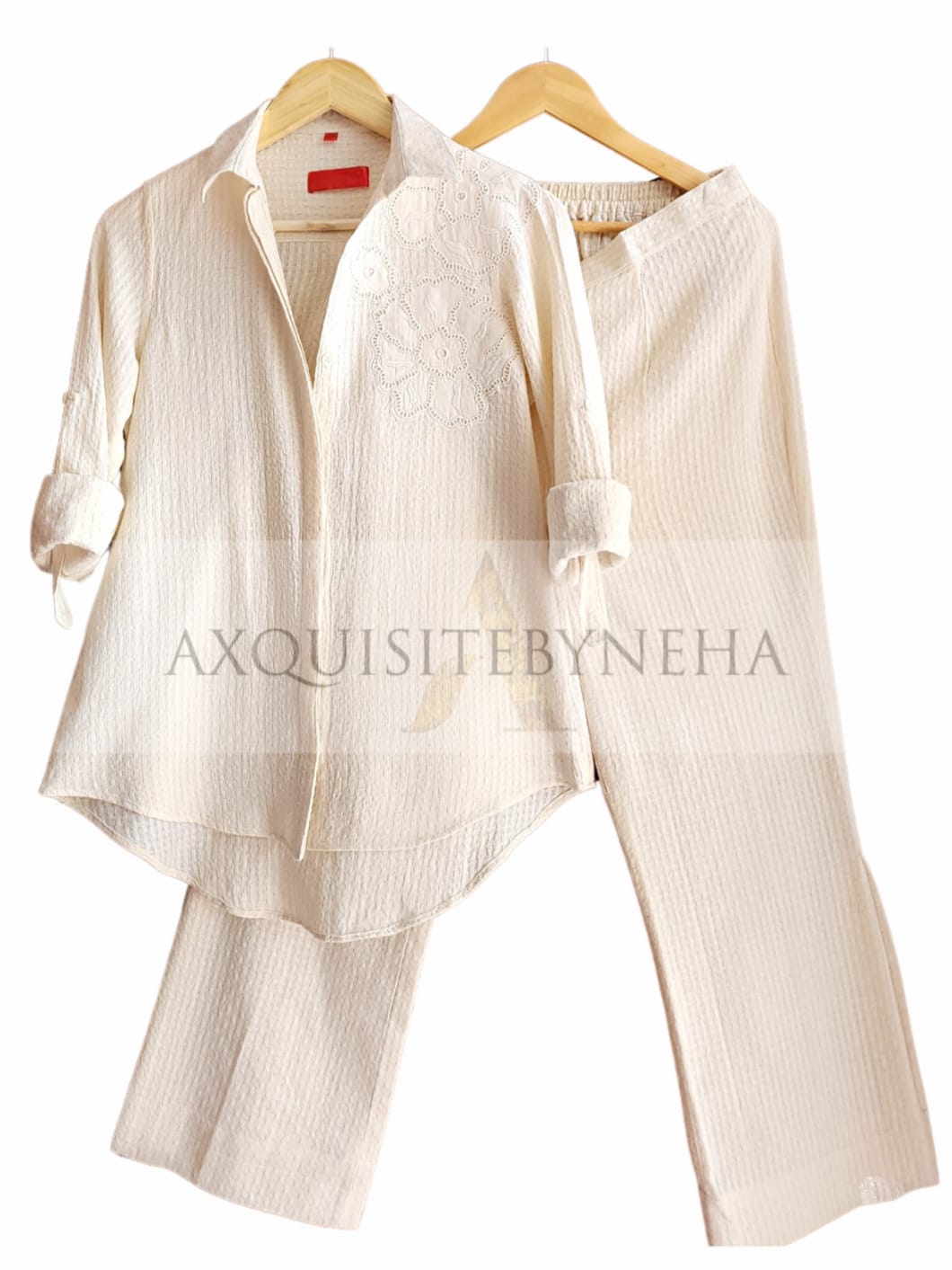 This Cotton Dobby fabric is perfect for the hot summer months! Let the self-work design, icru shade, and cutwork applique work on your shoulder cool you down while looking chic! So beat the summer heat in style!
