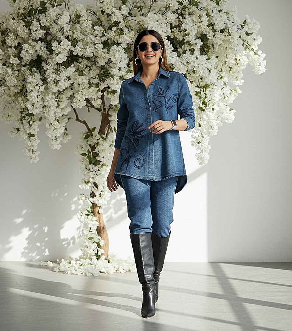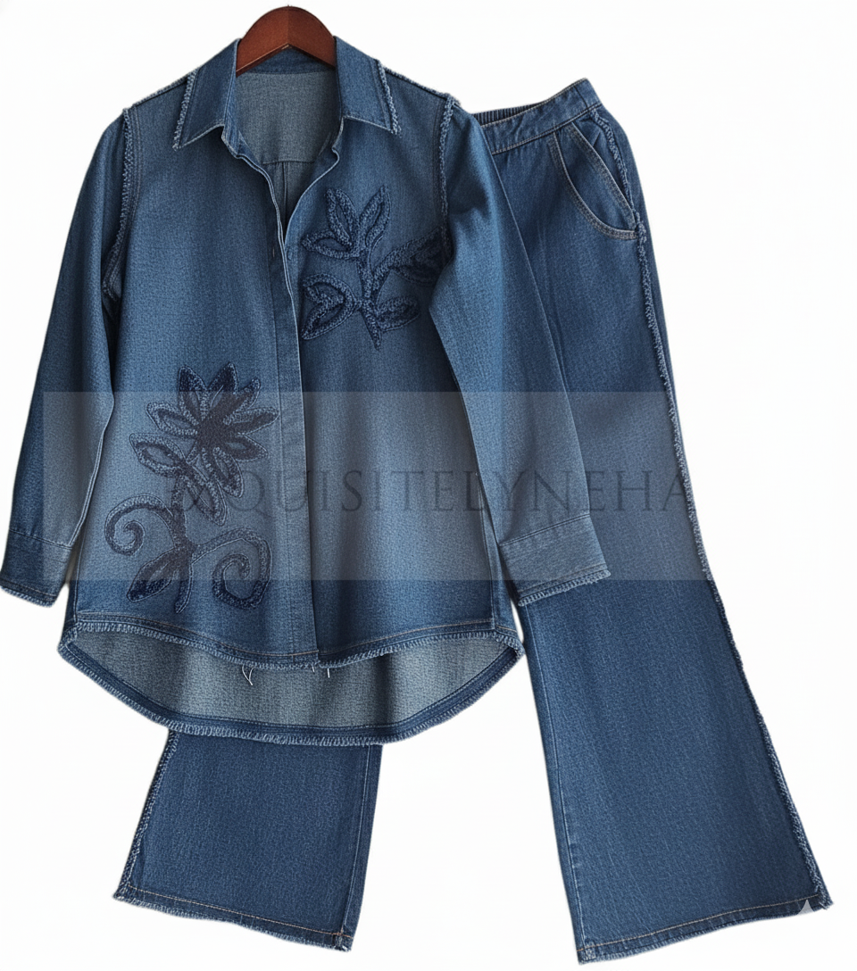 Find your perfect match in this exquisite two-piece denim set, where embroidered floral details meet relaxed fit sophistication. This coordinated set is perfect for coffee dates, brunches, or just lounging around.