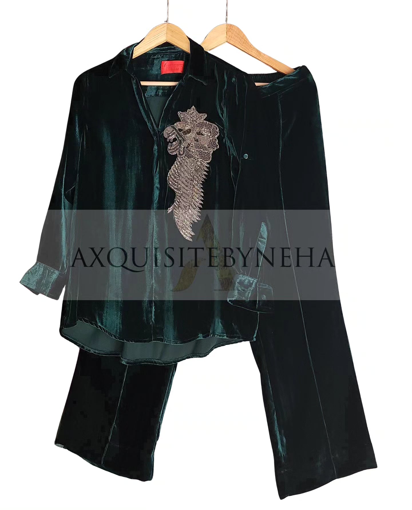 Marvel in the luxuriance of this silk velvet full set coordset, featuring a superbly fine fabric, this timeless ensemble is available in all sizes.