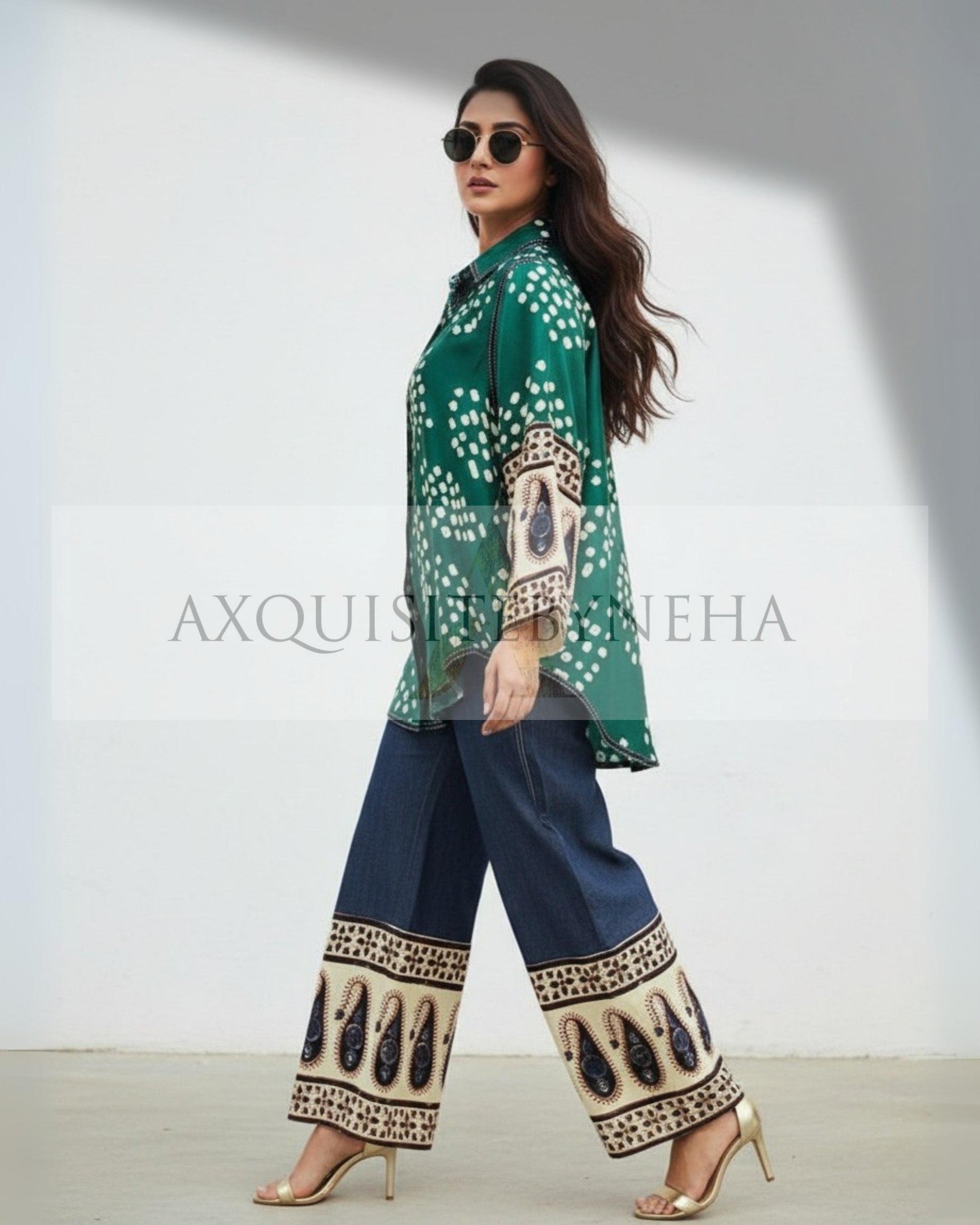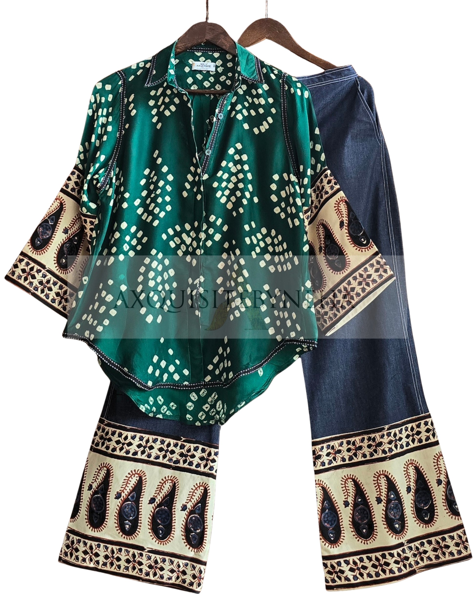 Introducing Emerld Green - the perfect balance of style and comfort. Our modal satin shirt features a beautiful Bandhani print, while the denim pants add a touch of edge. Upgrade your wardrobe with this super stylish ensemble, perfect for any occasion.