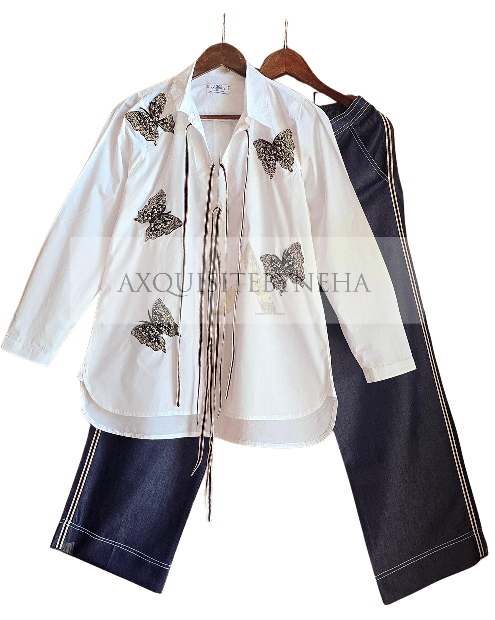Experience comfort and elegance with Five Butterflies poplin shirt. Made from high-quality white fabric and adorned with delicate butterfly motifs, this shirt is the perfect addition to any wardrobe. Pair it with blue denim pants for a classic and sophisticated look.