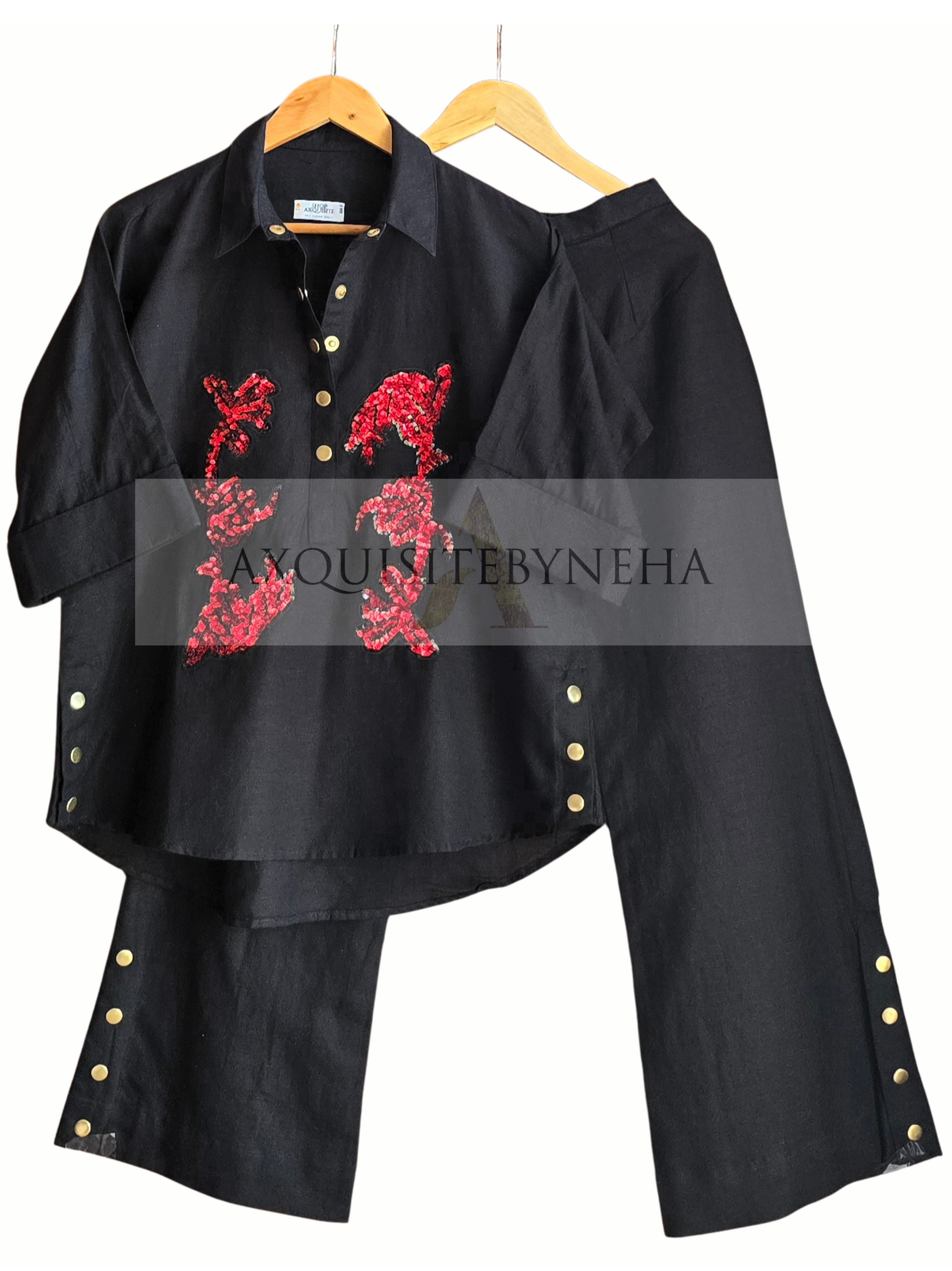 The look features a coordinated black ensemble with beautiful red floral embroidery on the tunic-style top, paired with matching straight-leg pants that have decorative button details along the hem. It's a sophisticated casual-to-dressy outfit that would work well for brunch, shopping, or other daytime occasions where you want to look polished but comfortable.
