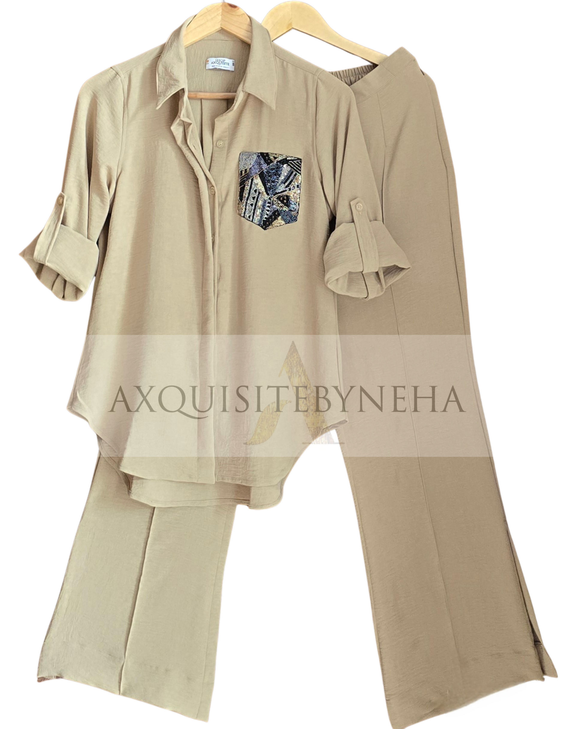 Introducing the Light golden Cotton Crepe set, designed to elevate your summer style. Made from a blend of cotton twill and crepe, this set features a flowing cotton fabric and intricate embellished pocket detailing. Stay cool and fashionable all season long.