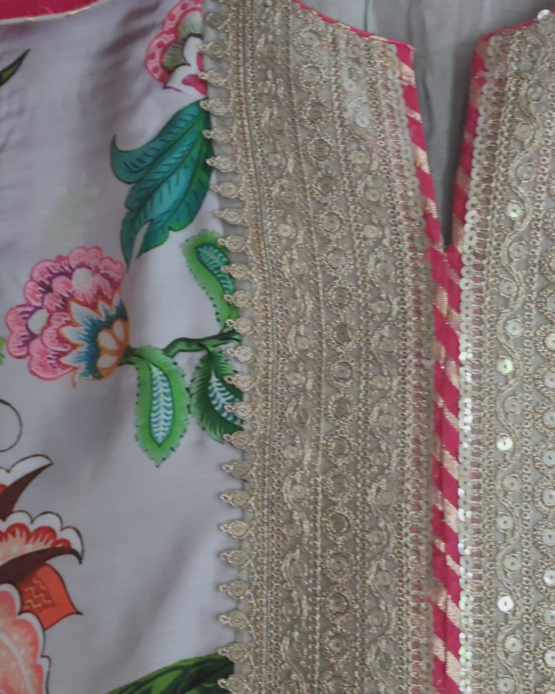 This exquisite piece of grey chanderi silk boasts intricate embroidery and delicate sequin work. Its elegant grey hue exudes sophistication, making it the perfect addition to any luxury wardrobe. Experience the tactile sensation of this premium fabric and elevate your style with this timeless piece.