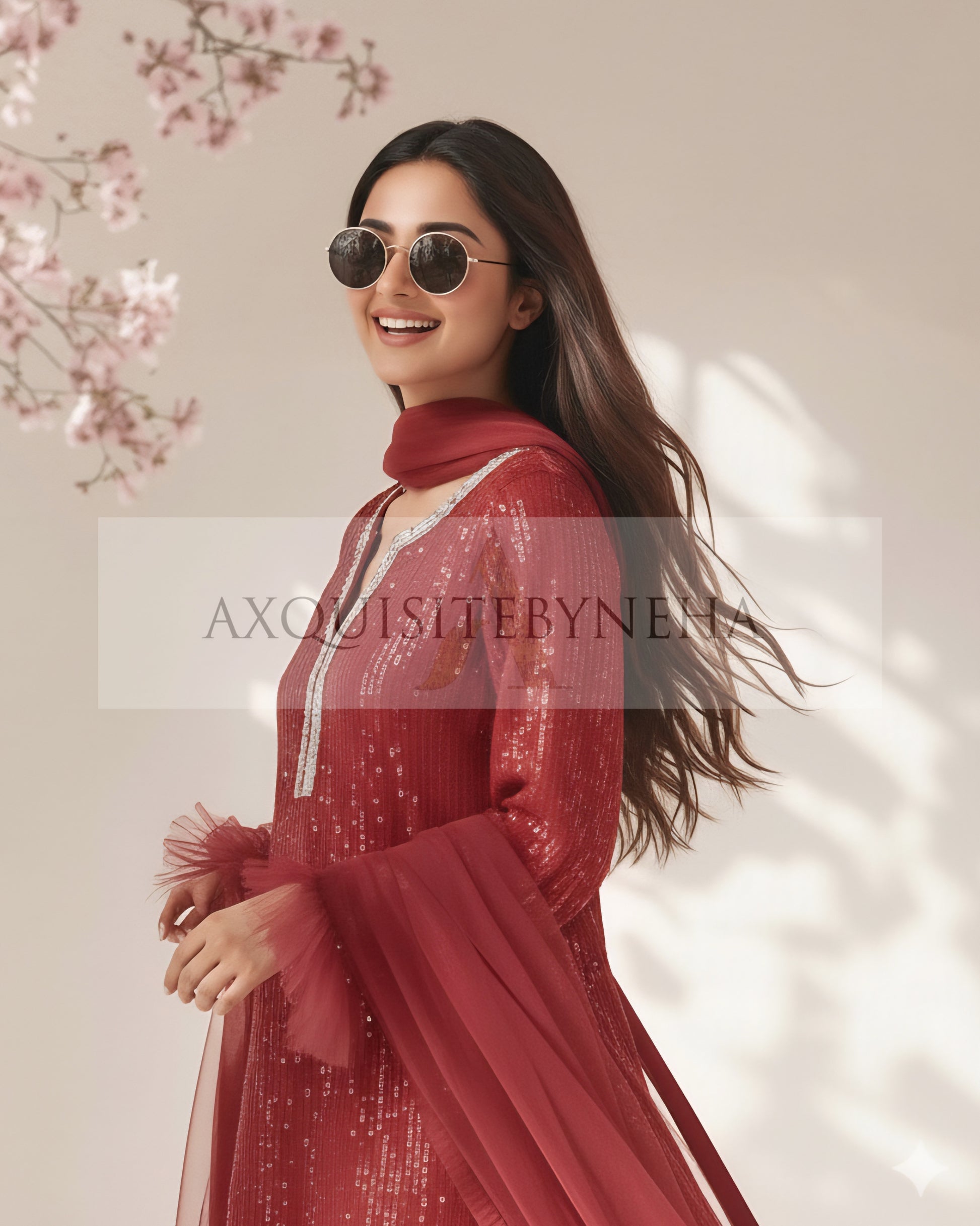 with our Deep Red Sequins Georgette Suit Set. This elegant georgette suit features stunning sequins work on the kurta and pants, while the georgette and net frill dupatta adds a touch of sophistication. Shine in style with this must-have edit!