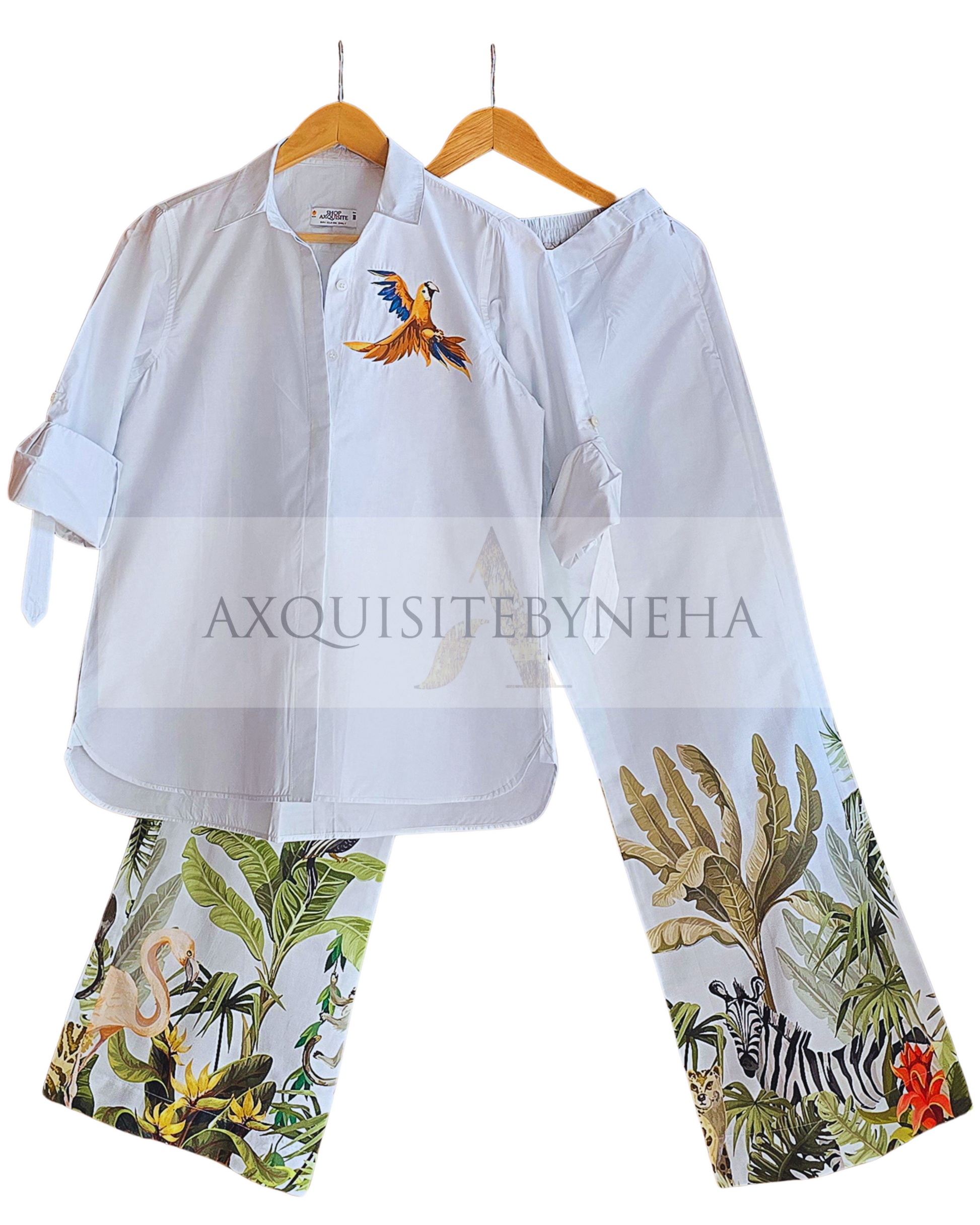 Kingfisher Bird set is made from luxurious light blue cotton poplin, this set is both comfortable and stylish. The printed pants add a touch of whimsy, making it perfect for a relaxing day at holiday or a casual outing. Embrace sophistication and comfort with Kingfisher Bird.