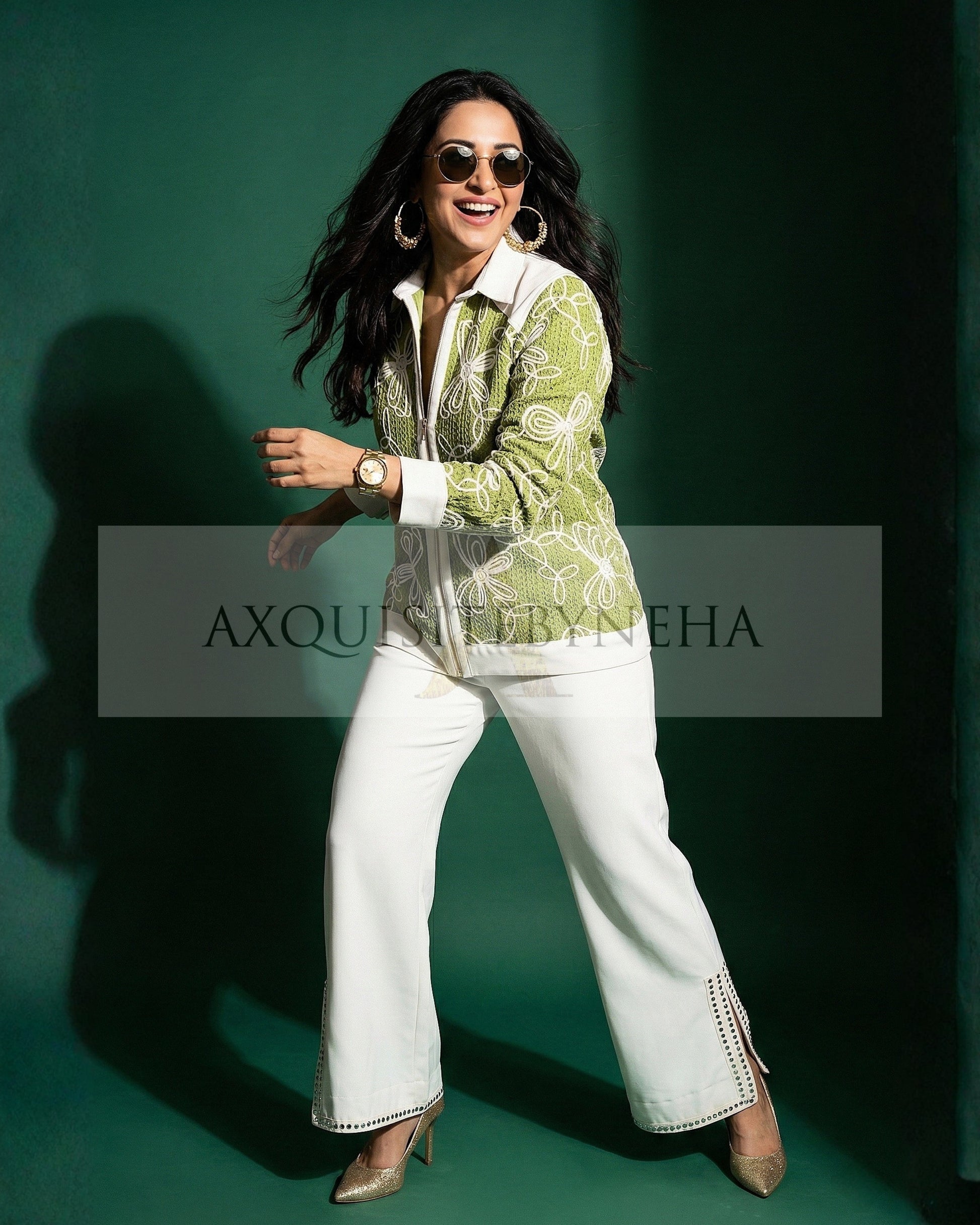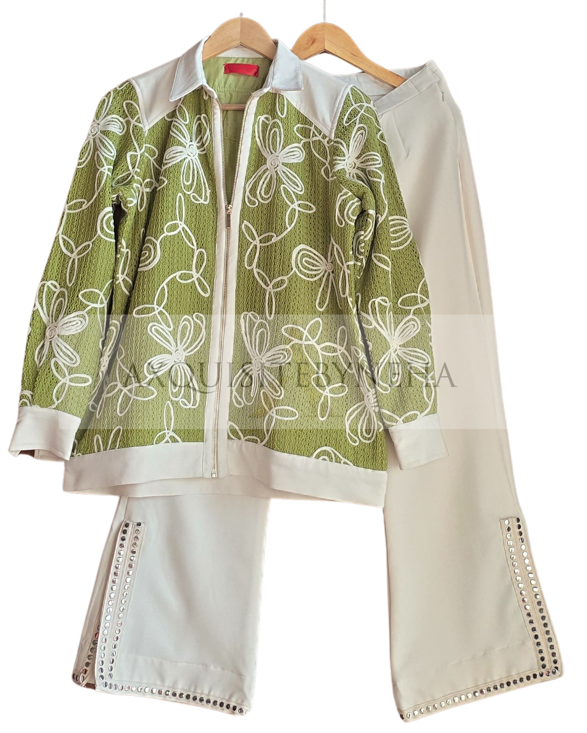 Our embroidered Floral jacket and White flare pants set! 🌸