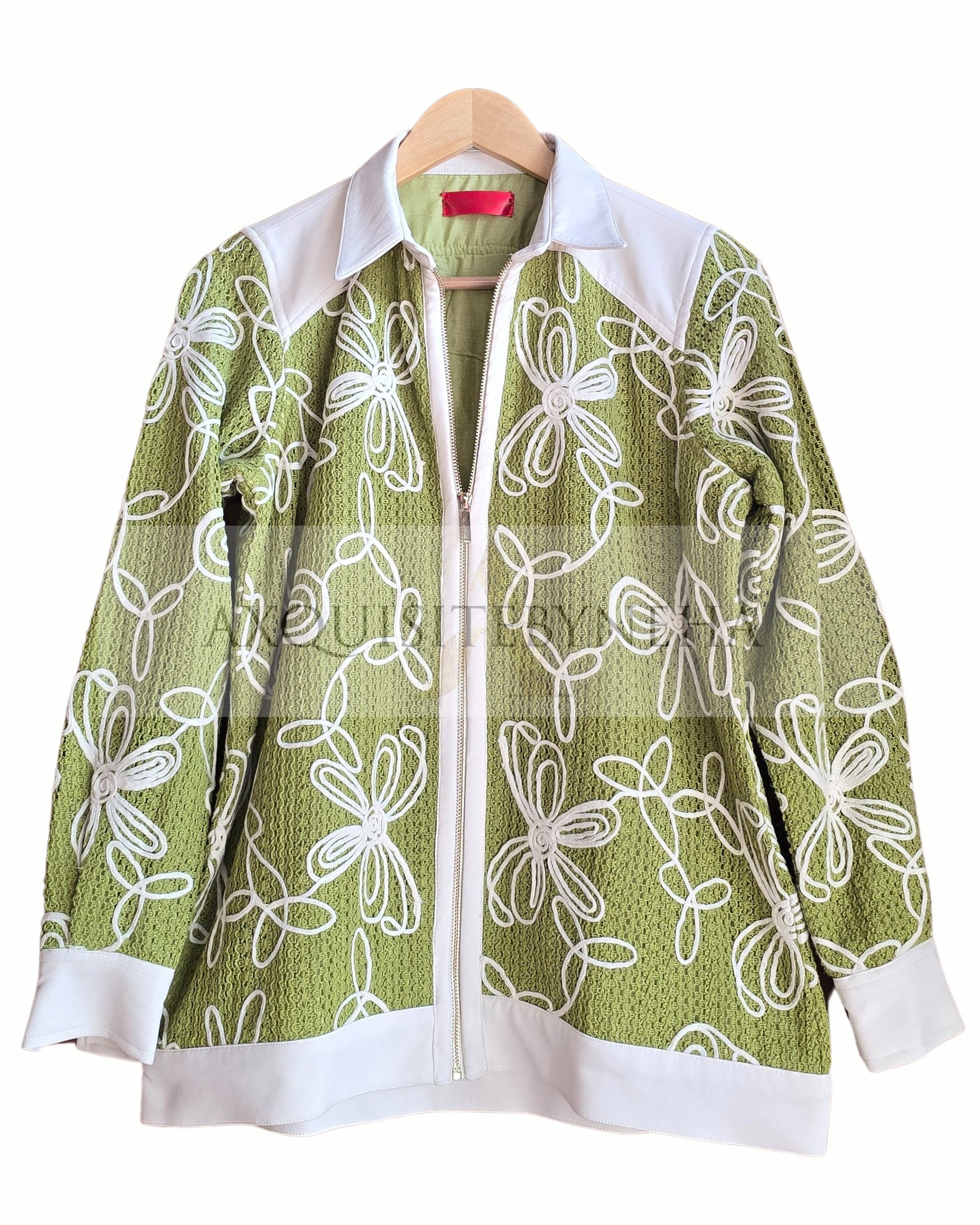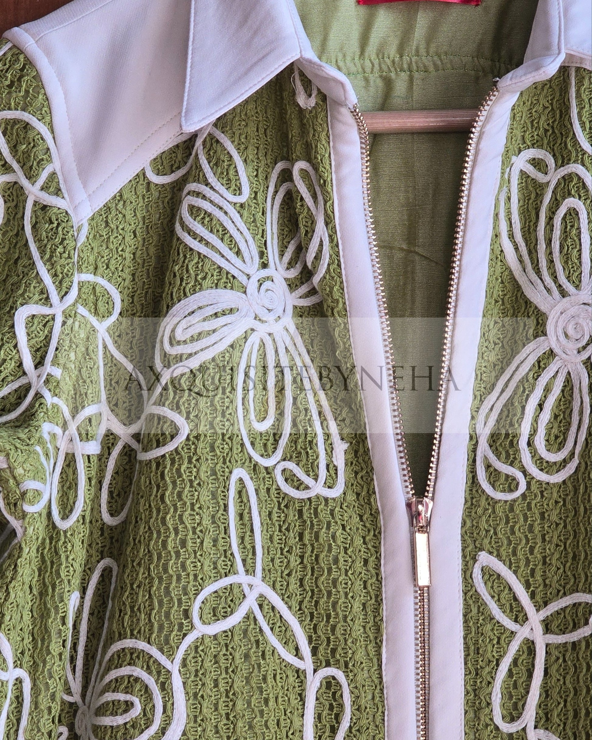 The olive green fabric with white embroidery adds a touch of elegance.