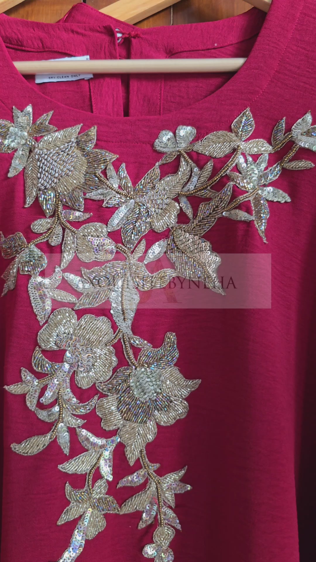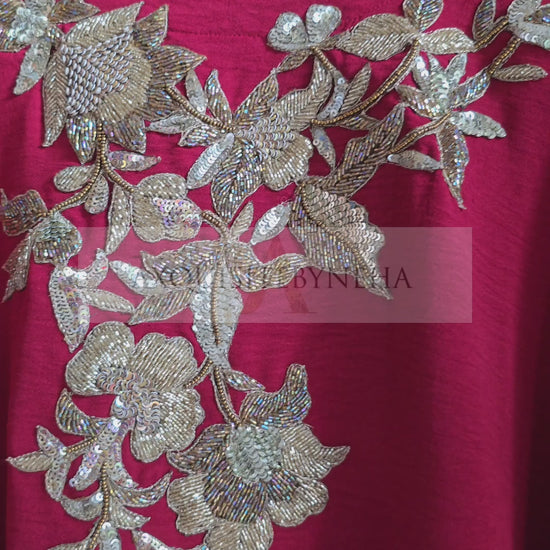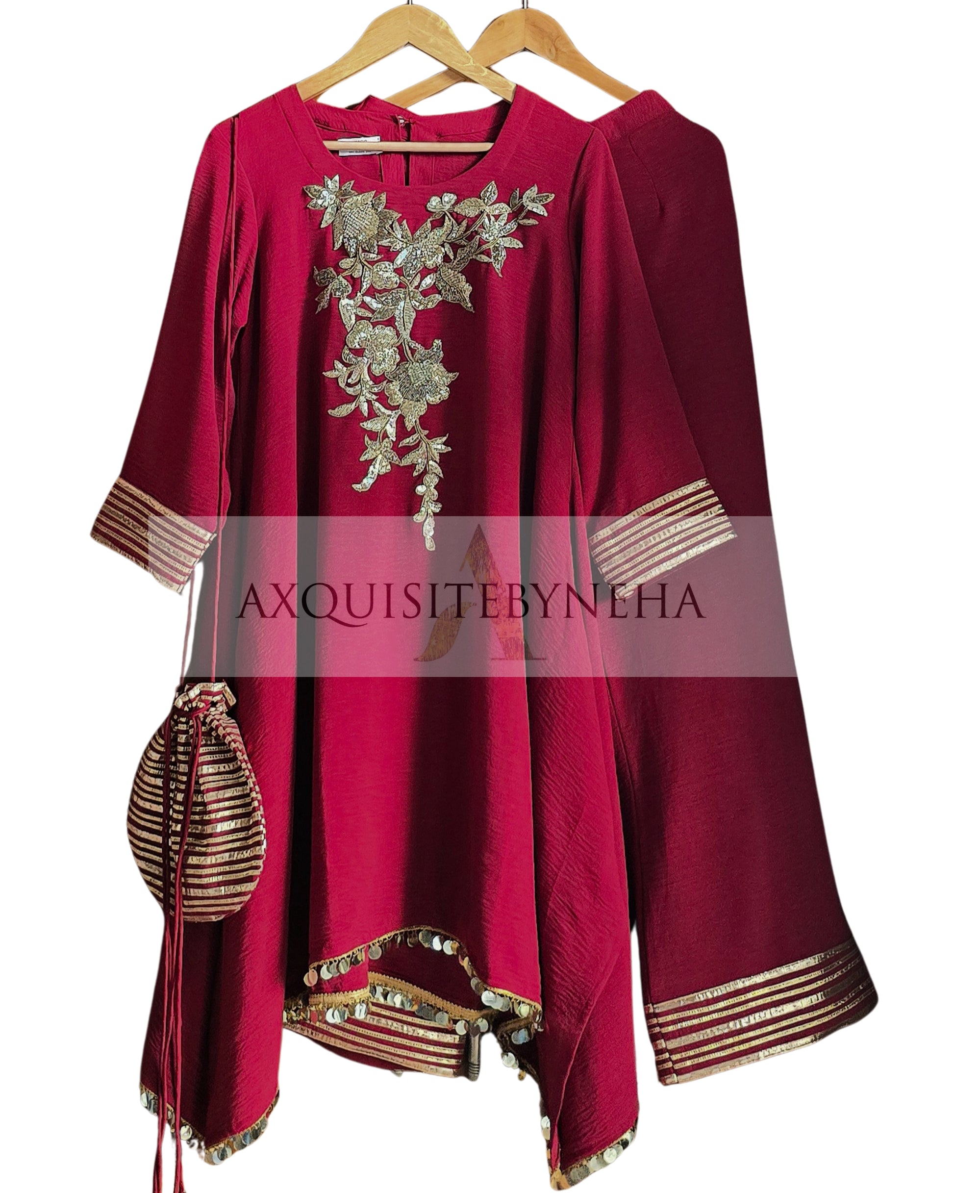 This Maroon Asymmetrical Festive Vibes piece is made of Dark red cotton crepe fabric, featuring intricate handwork embroidery. Part of a special festive collection, this garment is perfect for Karwa Chauth celebrations. Experience the beauty and craftsmanship of handwork detailing in this unique and elegant piece.