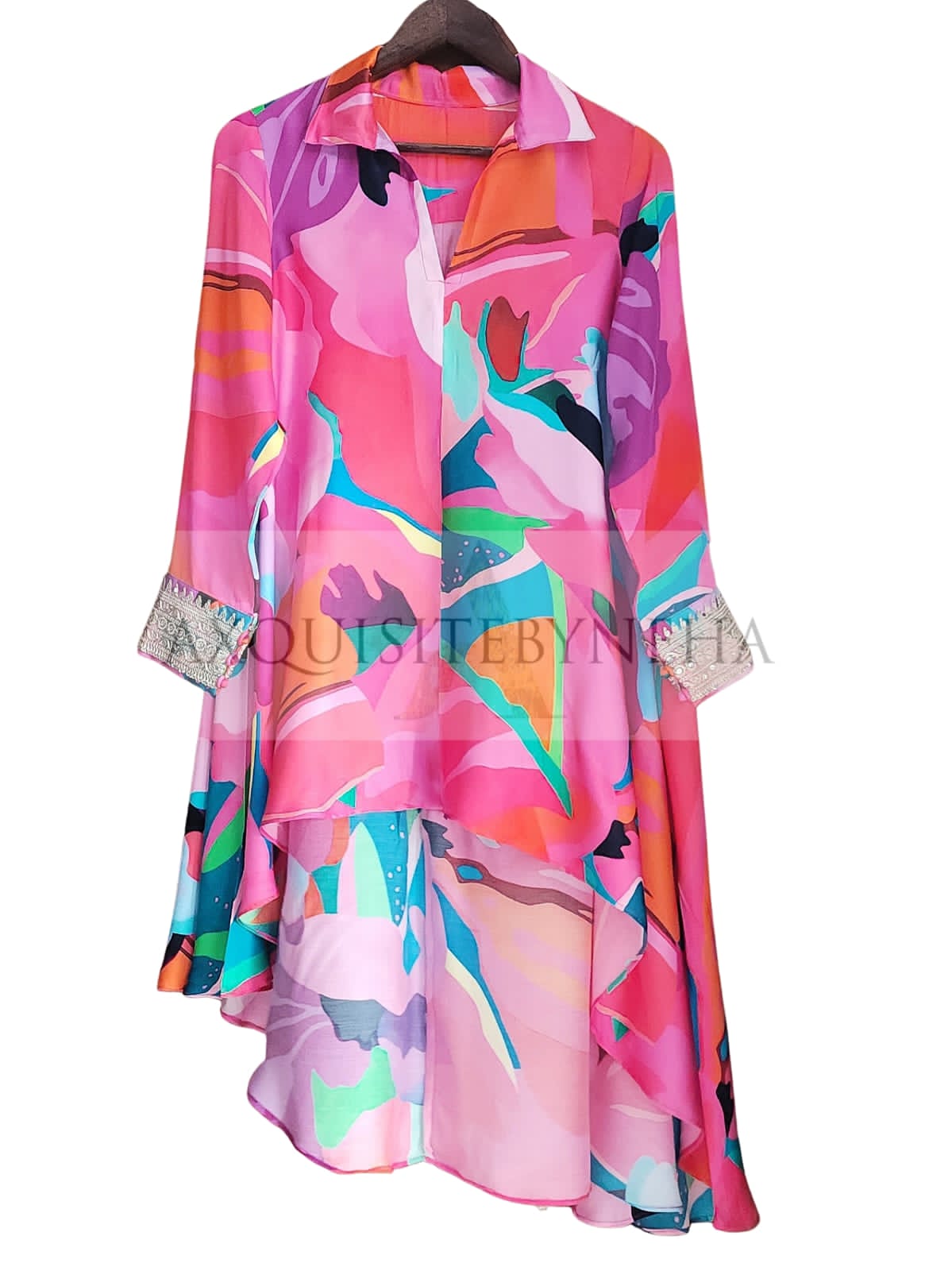 Turn heads in this one-of-a-kind, pink asymmetrical set! You'll feel glamorous and sophisticated in the Modal Satin with Zari work detailing. Wear it on special occasions to really show them you mean business! Perfectly paired with Cotton Lycra pants, it'll help you look sharp and fly like an eagle!