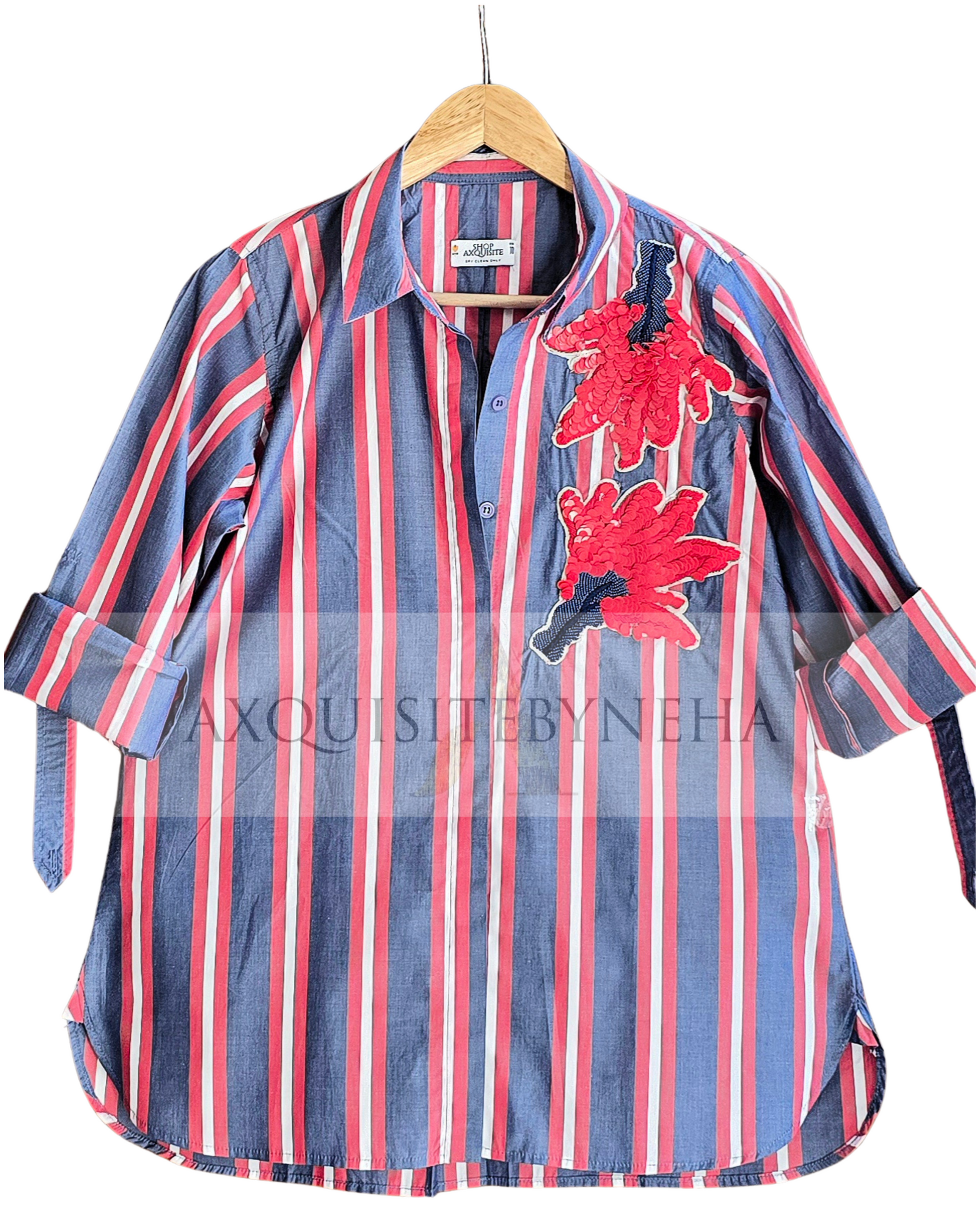 "Indulge in effortless style with our Red & Blue shirt and denim pants combo. The luxurious cotton material features stunning sequin details, elevating your look to chic sophistication. The classic red and blue stripes add a touch of playfulness to the ensemble. Upgrade your wardrobe with this exclusive piece."
