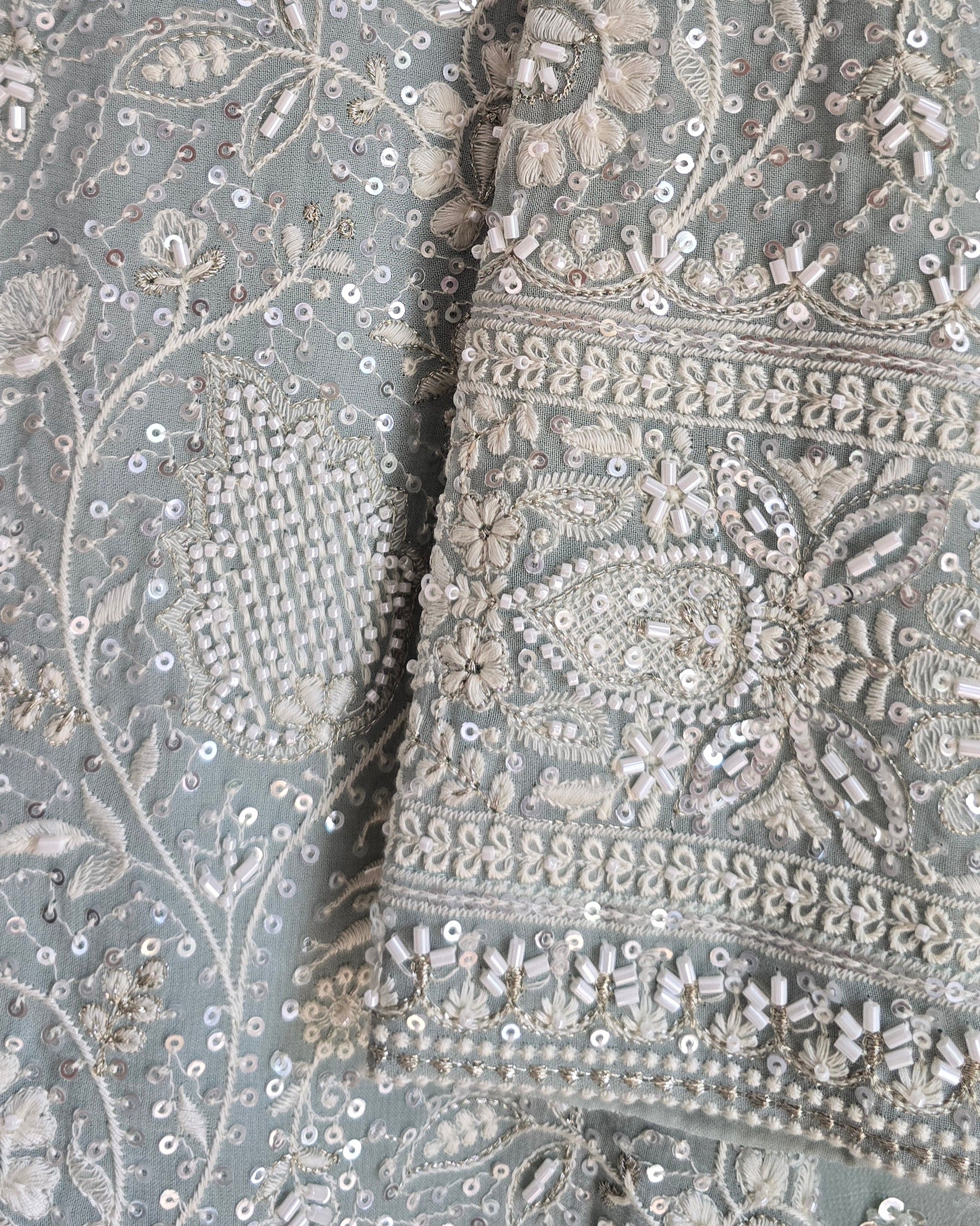 This elegant and classy suit set is perfect for any party occasion. Crafted from sea green georgette, it features delicate embroidery for added sophistication. Look and feel your best in this stylish and timeless piece.
