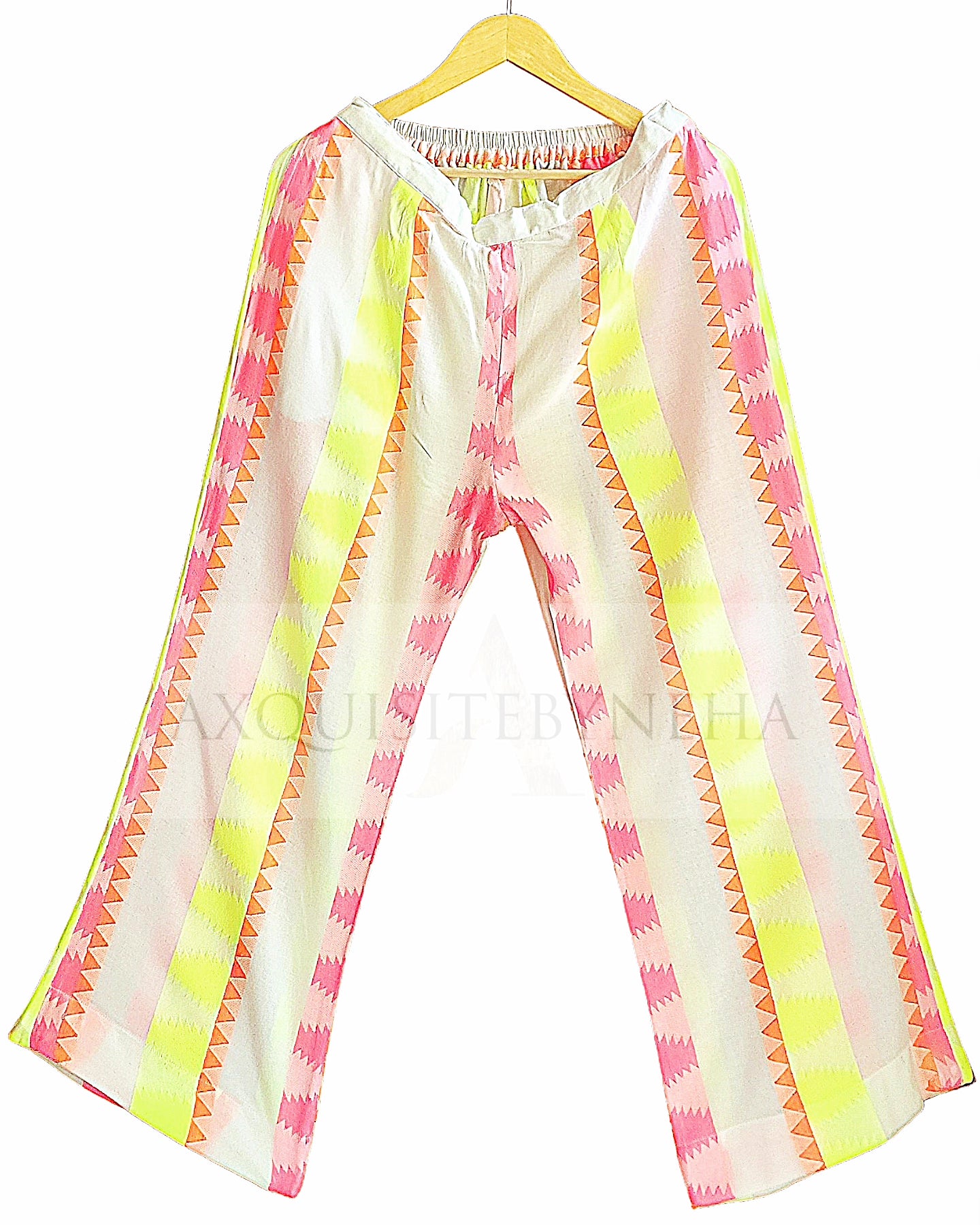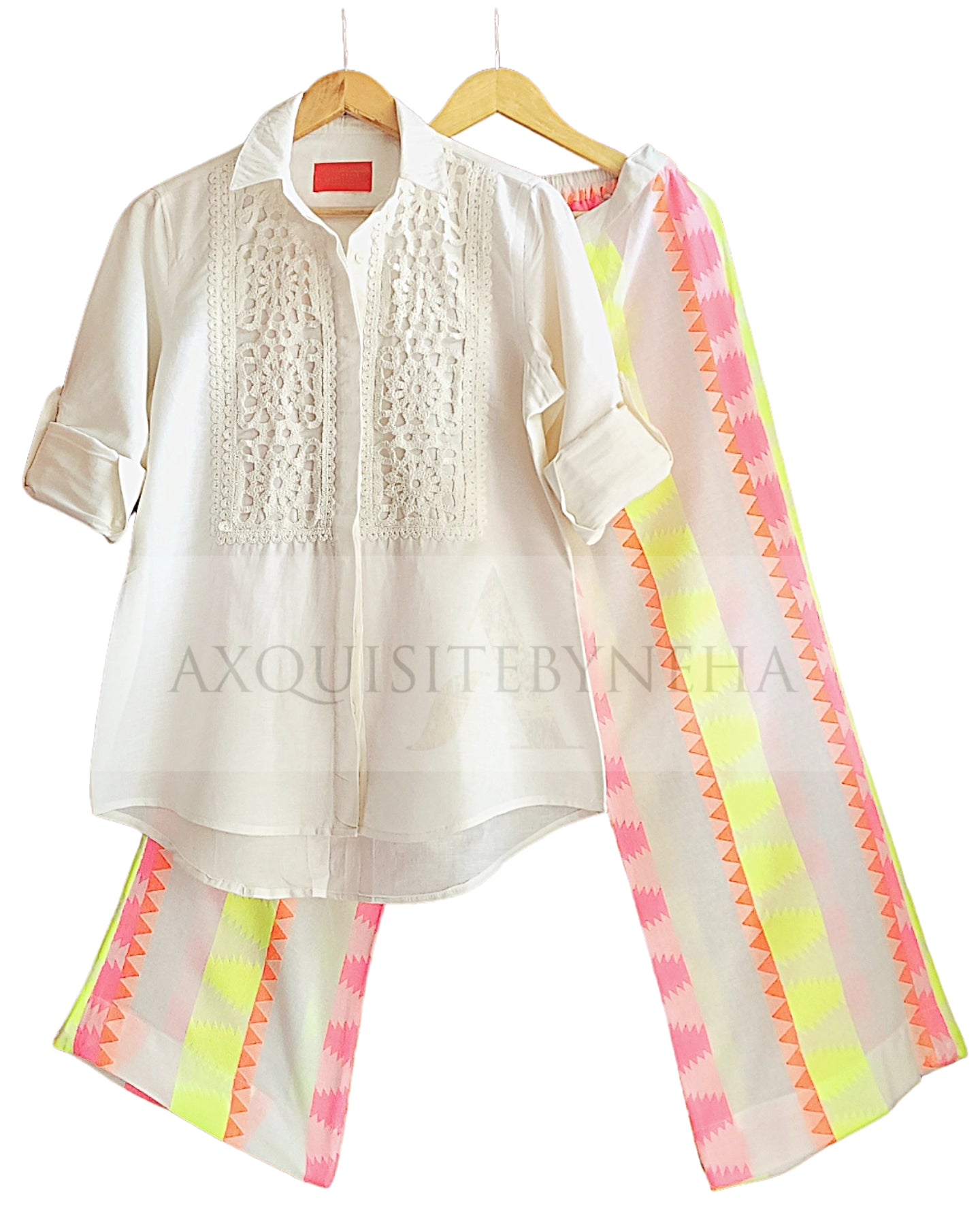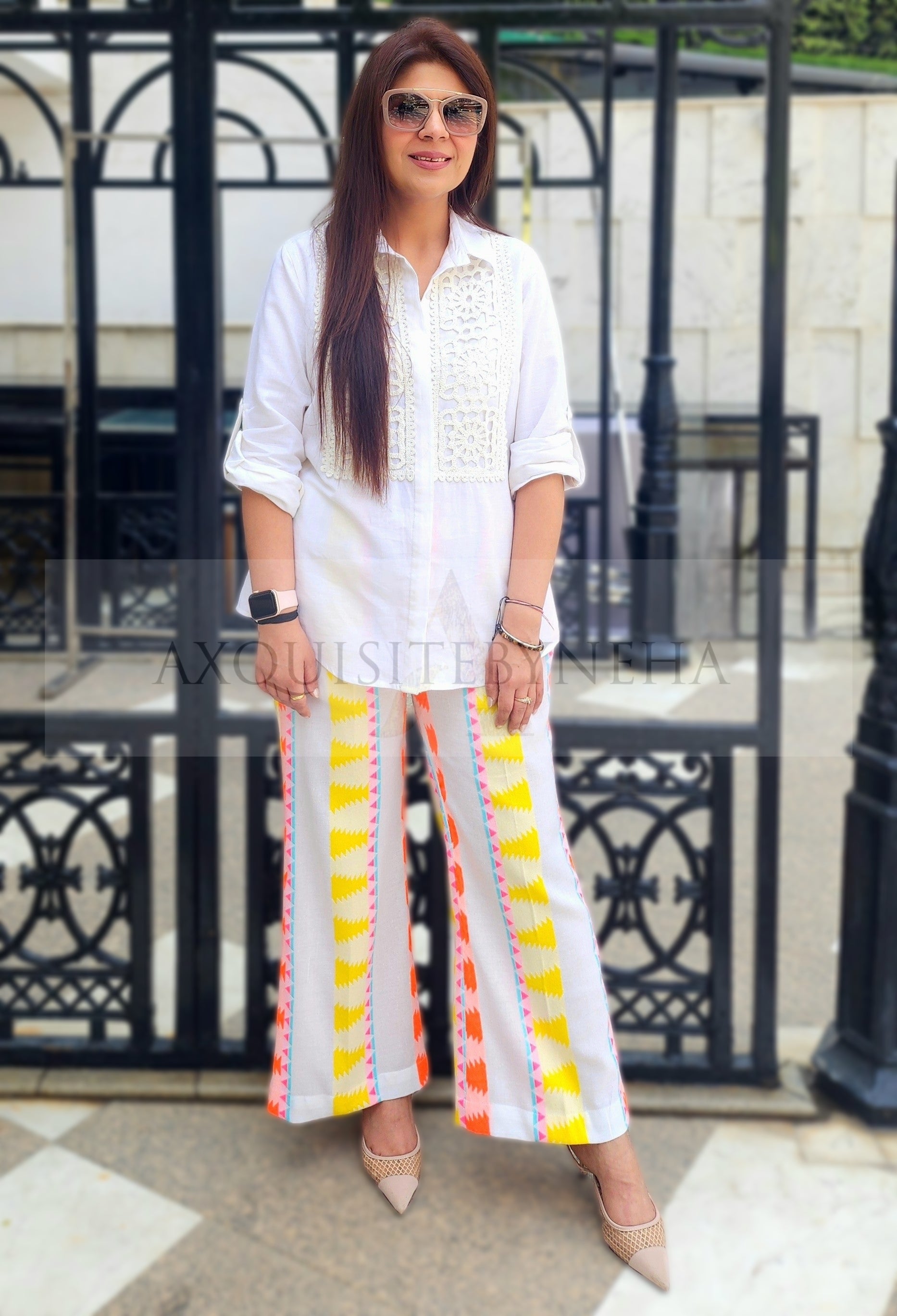 Luxury with Super White. This cotton linen shirt boasts intricate cutwork detailing, elevating it to a work of art. Paired with brightly-hued jacquard pants, this ensemble exudes sophistication and exclusivity. Elevate your wardrobe with Super White.