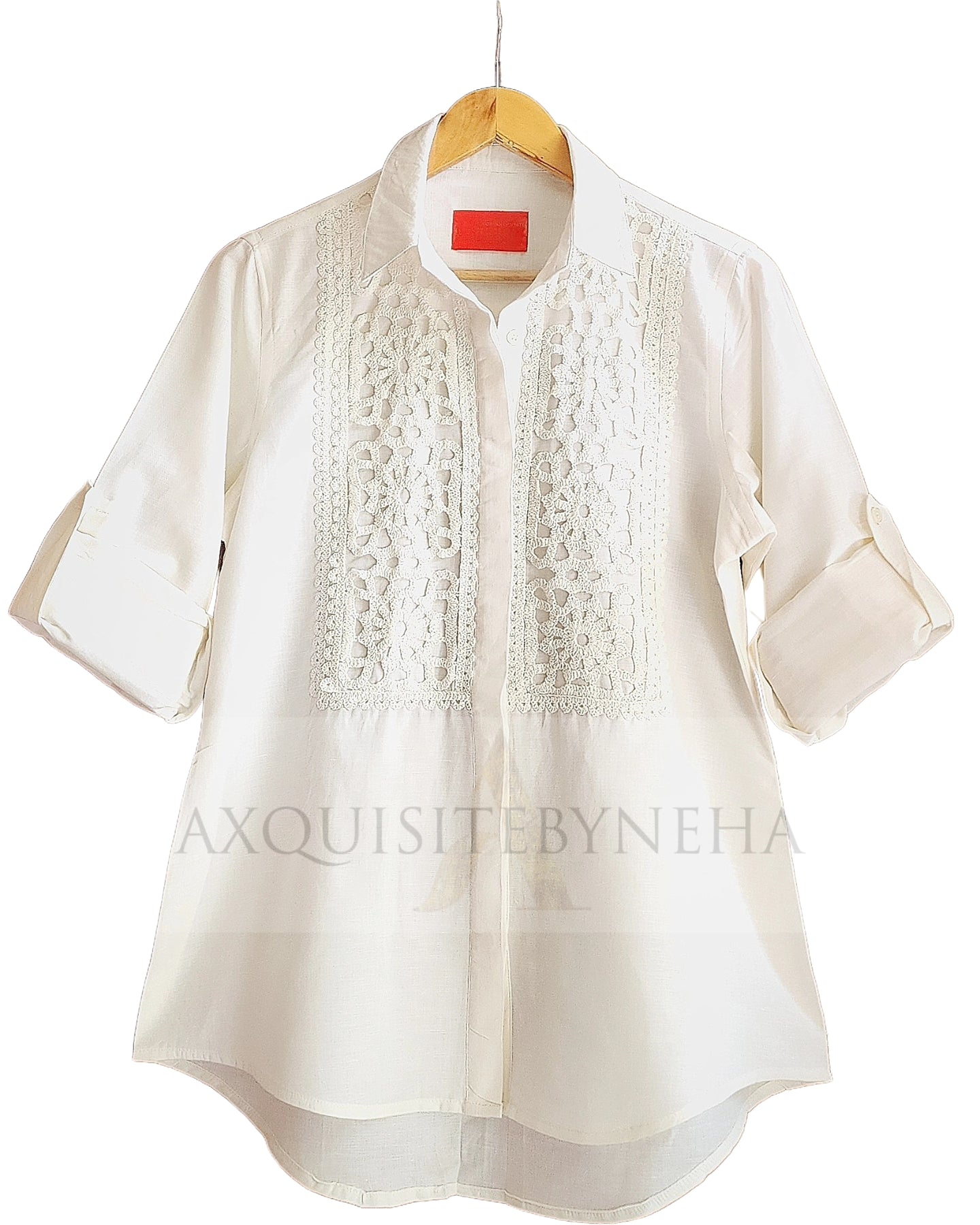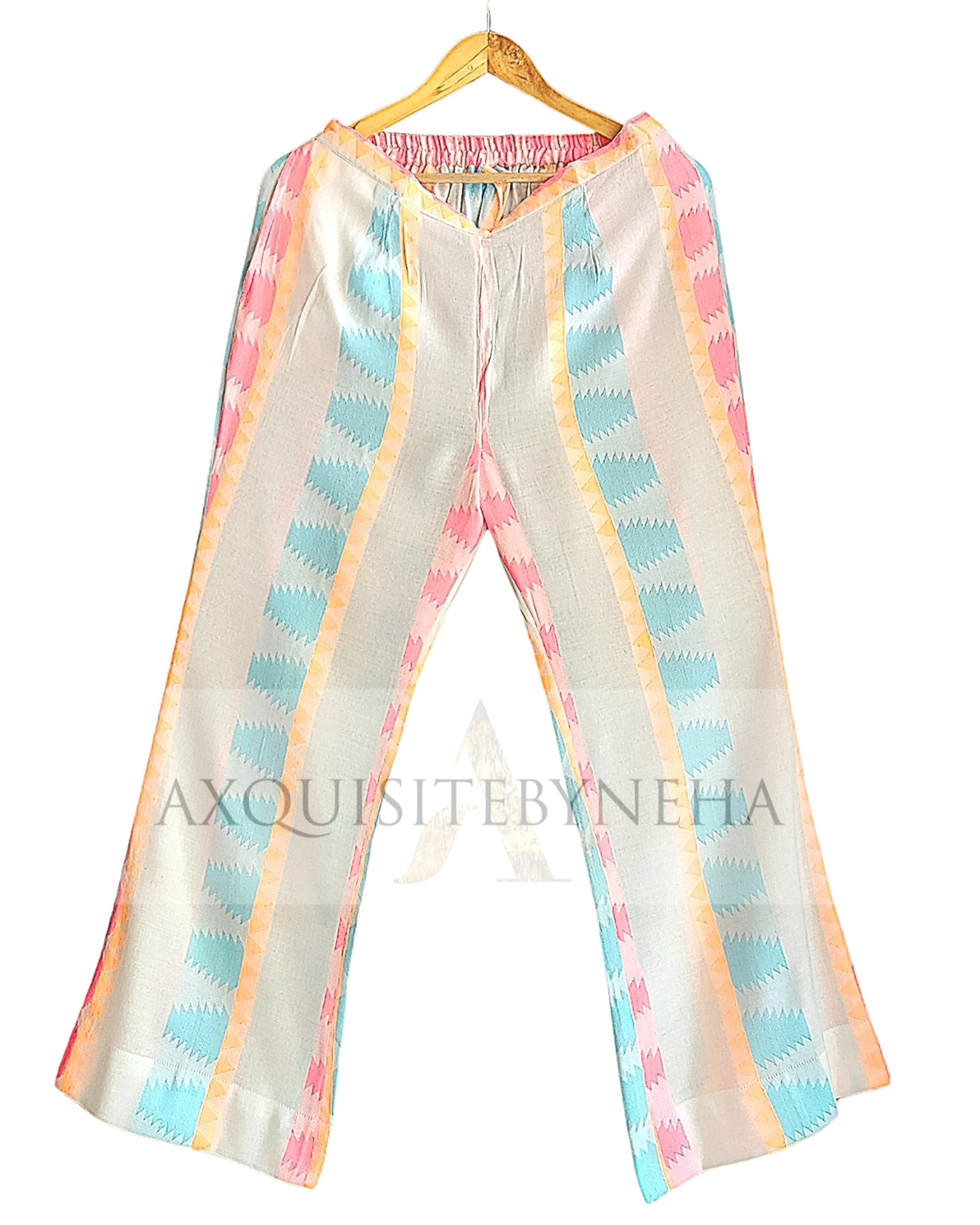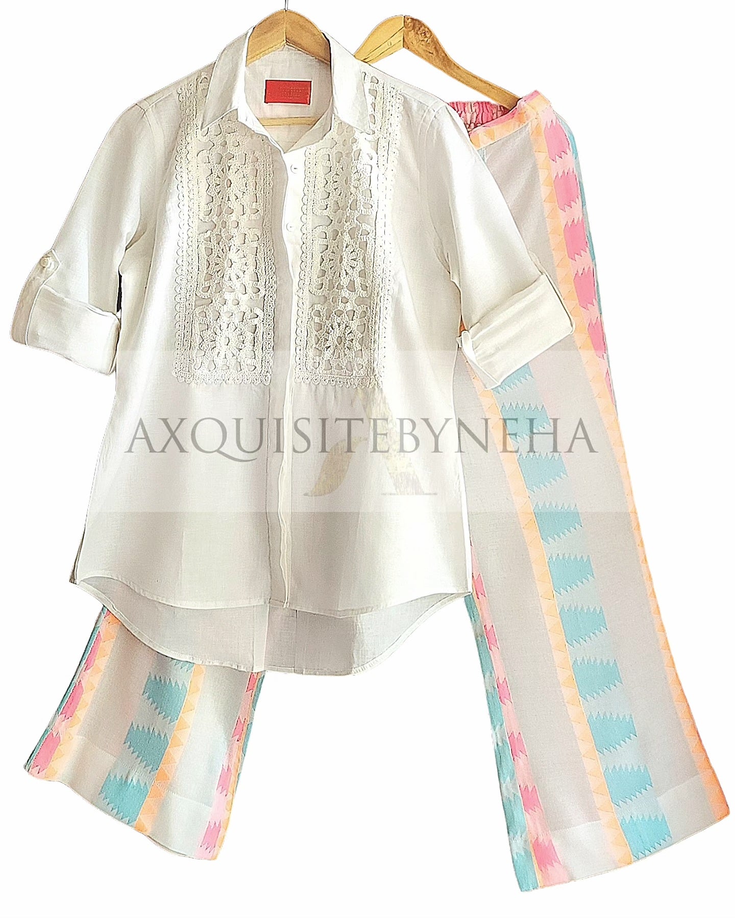 Luxury with Super White. This cotton linen shirt boasts intricate cutwork detailing, elevating it to a work of art. Paired with brightly-hued jacquard pants, this ensemble exudes sophistication and exclusivity. Elevate your wardrobe with Super White.